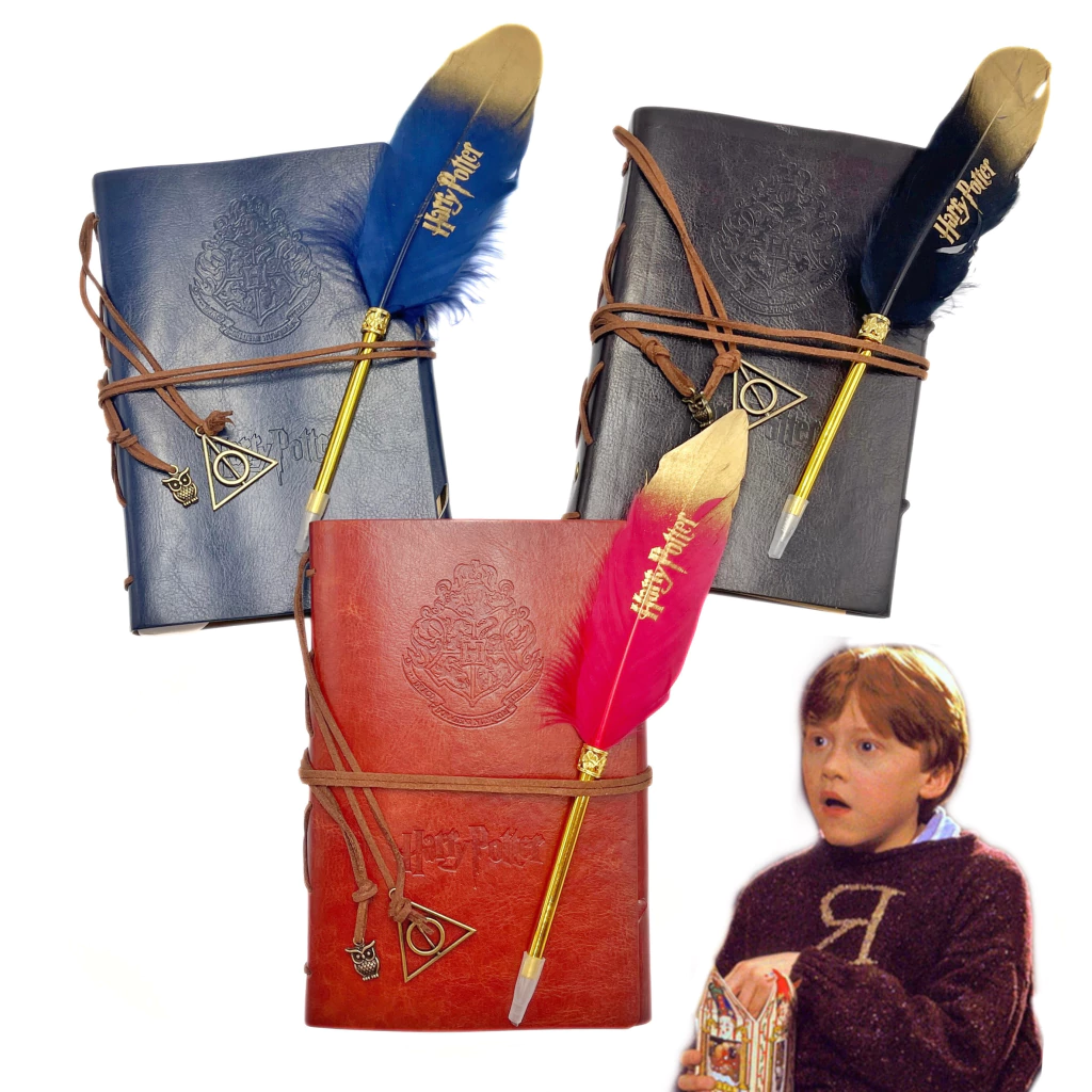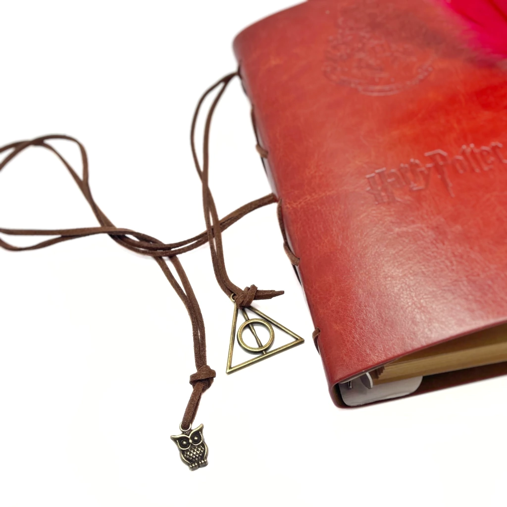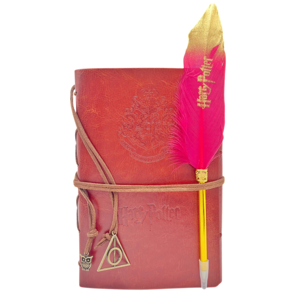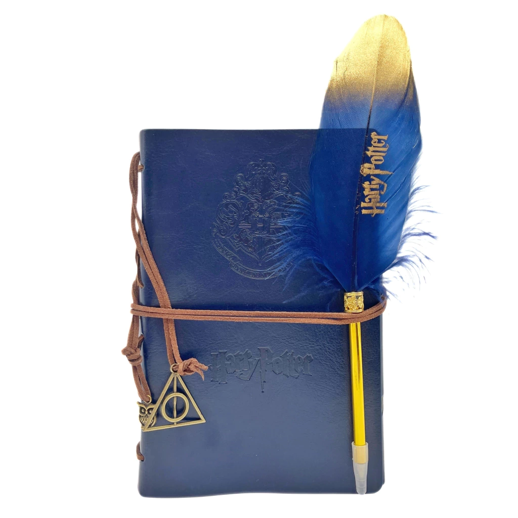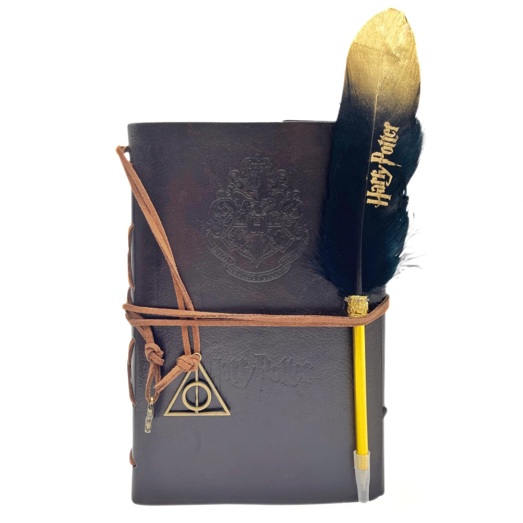 Kit do nosso bruxo favorito! Vem um fichário tamanho médio em couro, com fecho de cordão e pingentes detalhados na ponta - você pode fazer diversas amarrações diferentes pra fechar - e por dentro as folhas são lisas. E o que é um caderno de magia sem uma pena especial para escrever nele? Essa caneta esferográfica na cor azul ou preta, é lúdica e divertida, e fecha esse conjunto com chave de ouro e bruxaria!