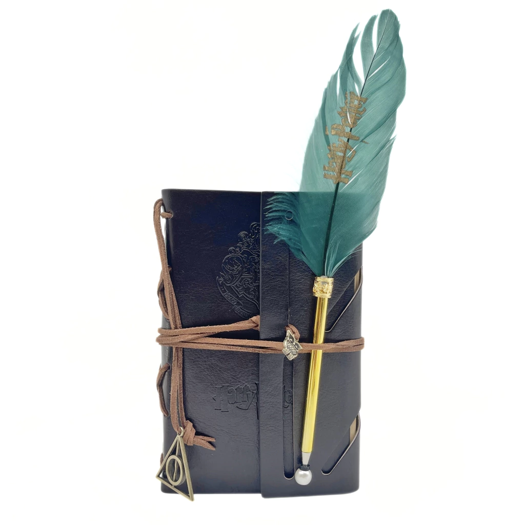 Kit do nosso bruxo favorito! Vem um mini fichário em couro, com fecho de cordão com pingente na ponta - você pode fazer diversas amarrações diferentes pra fechar - e por dentro as folhas são lisas. E o que é um caderno de magia sem uma pena especial para escrever nele? Essa caneta esferográfica na cor azul, é lúdica e divertida, e fecha esse conjunto com chave de ouro e bruxaria!