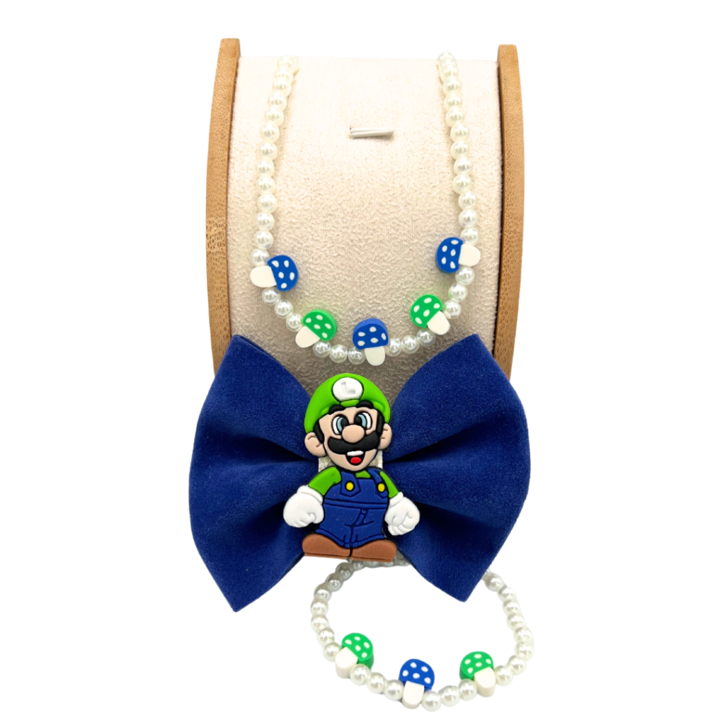 Kit composto de um colar e uma pulseira super estilosos, que combinam perfeitamente com os laços da Turma do Super Mario Bros.