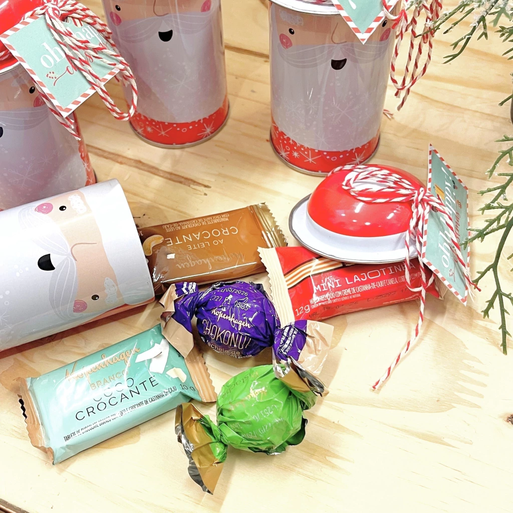 Uma lata temática natalina com itens de roncar a barriga! Vem com 5 chocolatinhos deliciosos da marca Kopenhagen.