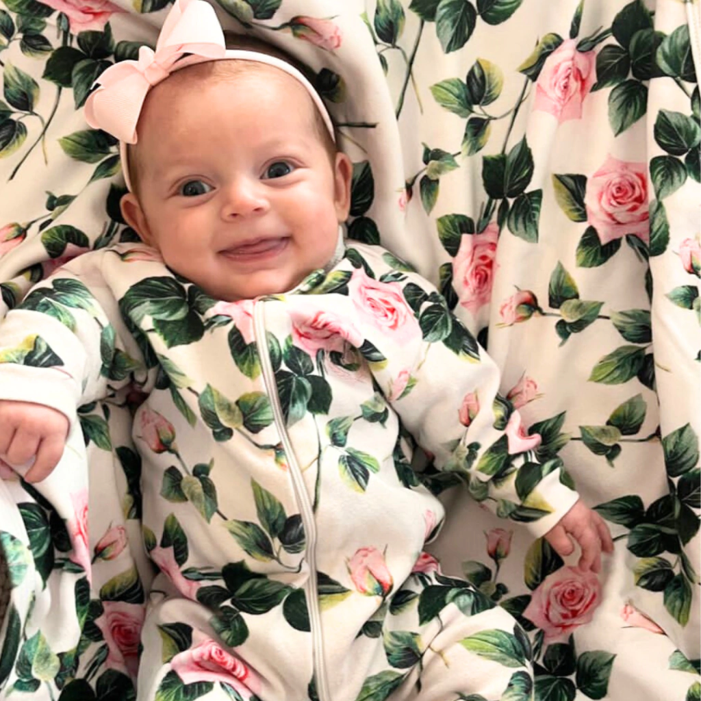 Macacão com zíper, com pé, estampado. Feito em tecido algodão egipcio