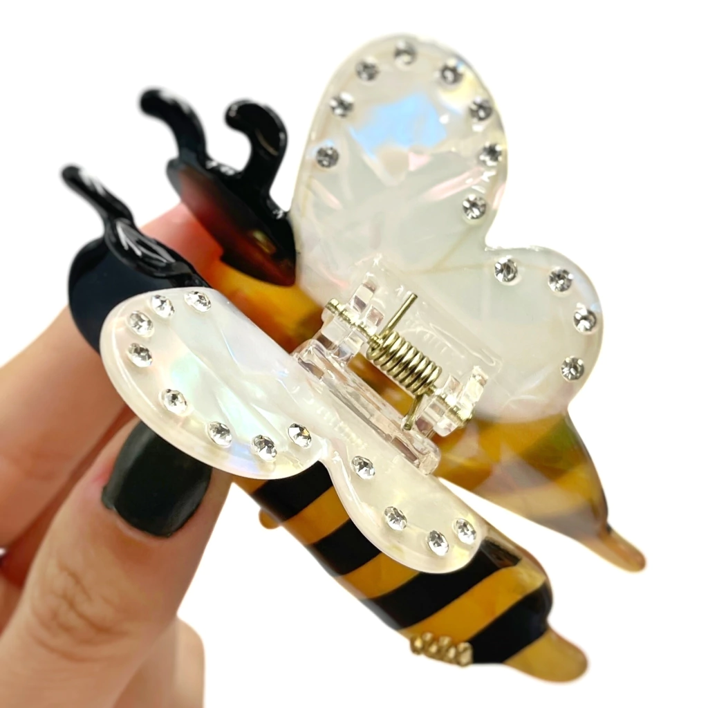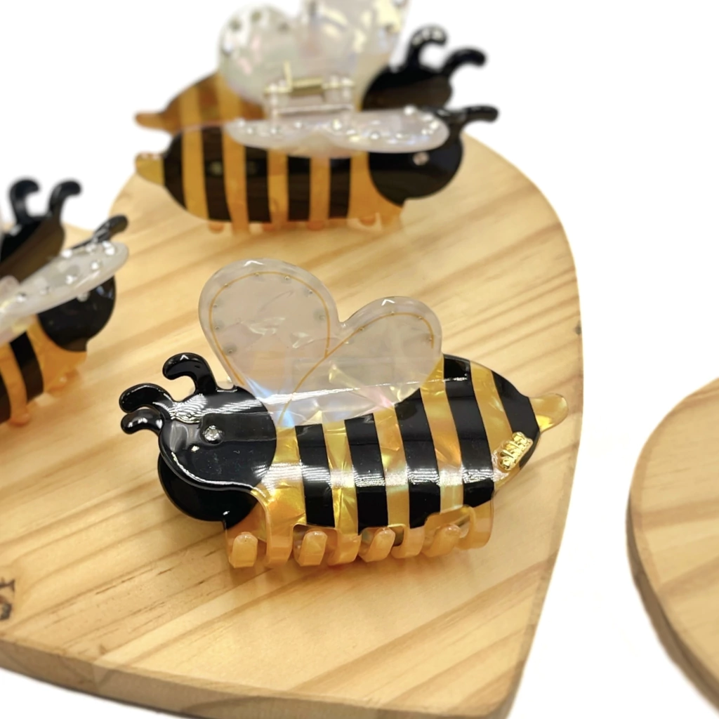 Piranha em formato lúdico de abelha. Superfície em madrepérola e detalhes de brilhantes aplicados. Linda, diferente e delicada na medida ideal!